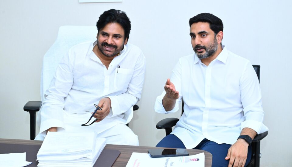 రాష్ట్ర ఉప ముఖ్యమంత్రి పవన్ కల్యాణ్ ను ఆయన ఛాంబర్ లో విద్య, ఐటి శాఖల మంత్రి లోకేష్ సోమవారం మర్యాదపూర్వకంగా కలుసుకున్నారు. ఈ నెల 25న మెగా డీఎస్సీ విజేతలకు నియామక ఉత్తర్వులు అందించే కార్యక్రమానికి హాజరు కావాలని పవన్ కల్యాణ్ ను ఆహ్వానించారు. గత అయిదేళ్లలో ఒక్క టీచర్ పోస్టు భర్తీ చేయకపోగా, మెగా డీఎస్సీని అడ్డుకునేందుకు ప్రత్యర్థులు దాదాపు 106 కేసులు వేశారని తెలిపారు. కూటమి ప్రభుత్వంలో ఇచ్చిన మాట నిలుపుకుందని తెలిపారు. దీనివల్ల ఏళ్ళ తరబడి ఎదురుచూస్తున్న నిరుద్యోగ టీచర్ల కలలు సాకారం అయ్యాయని మంత్రి లోకేష్ చెప్పారు.